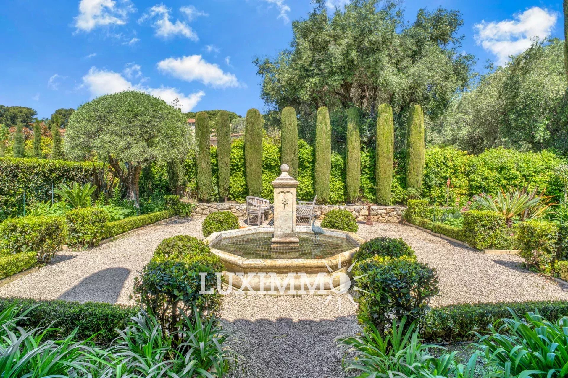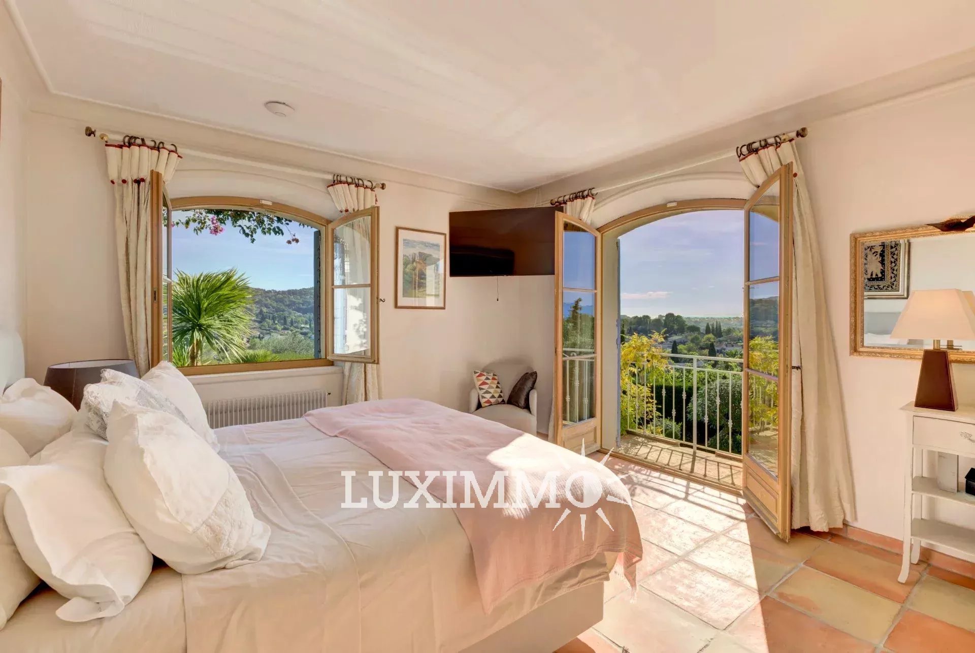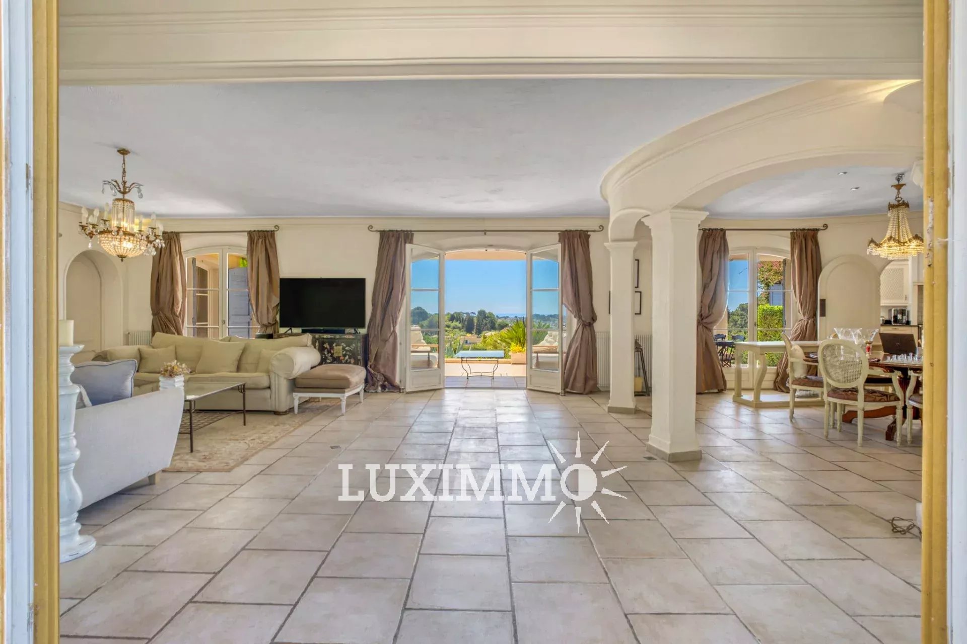 MOUGINS - Située au pied du village, à l'abri des regards, avec vue panoramique mer et collines, cette bastide provençale de 480m² env., est édifiée sur un terrain de 4200m² env. avec piscine.