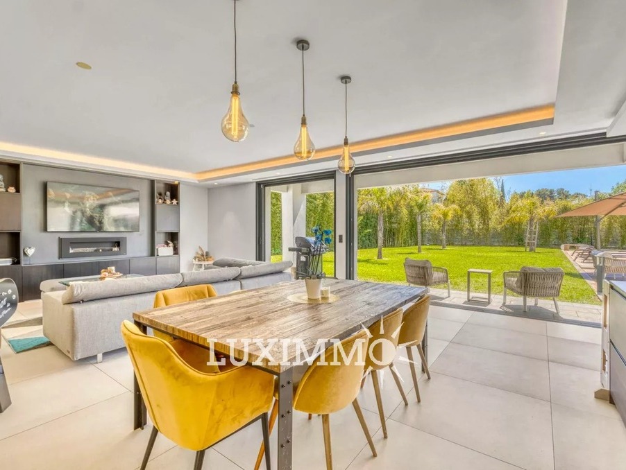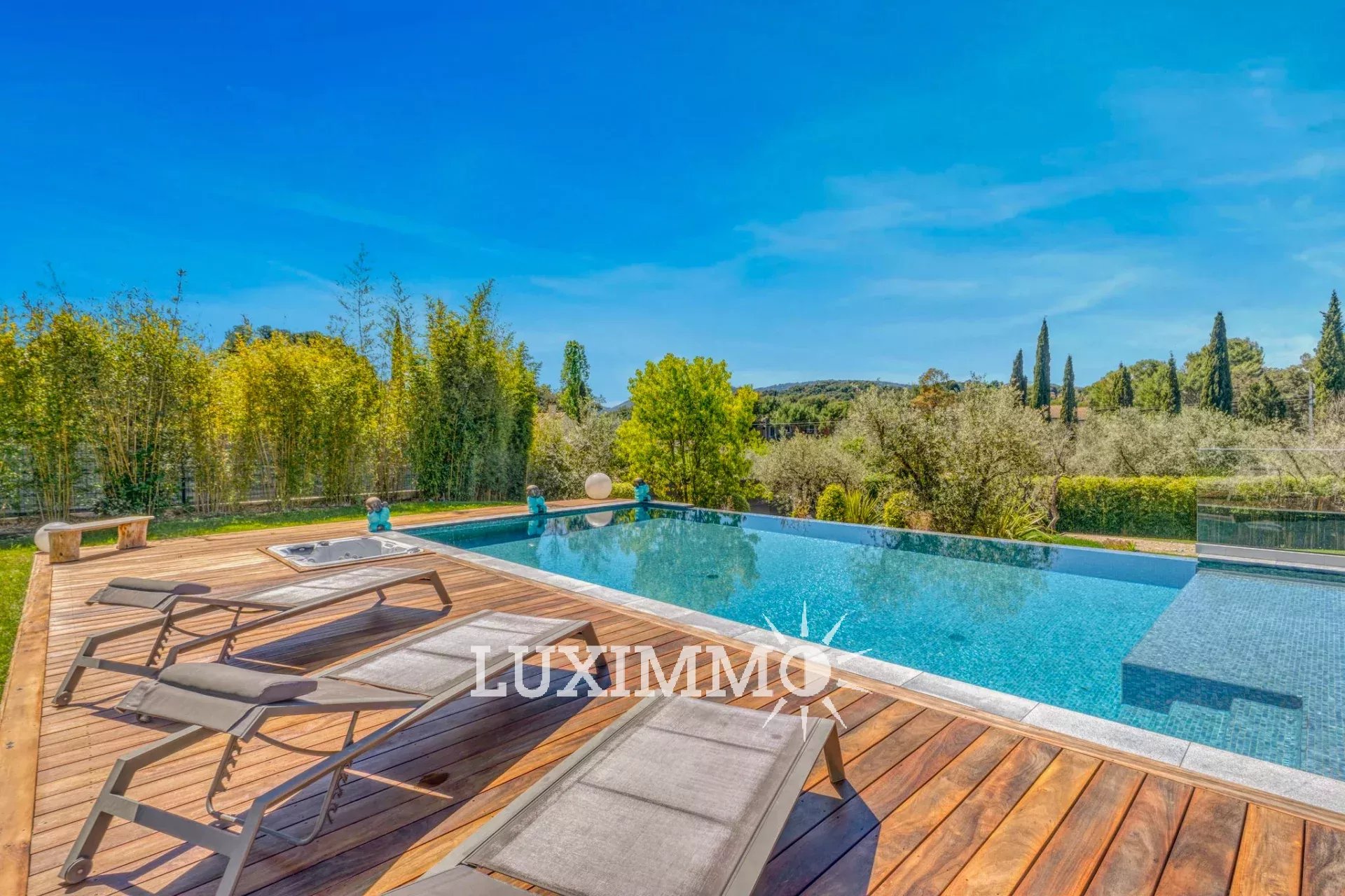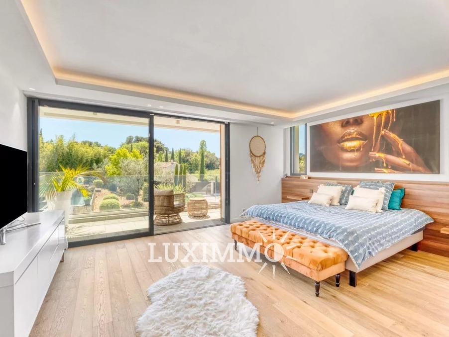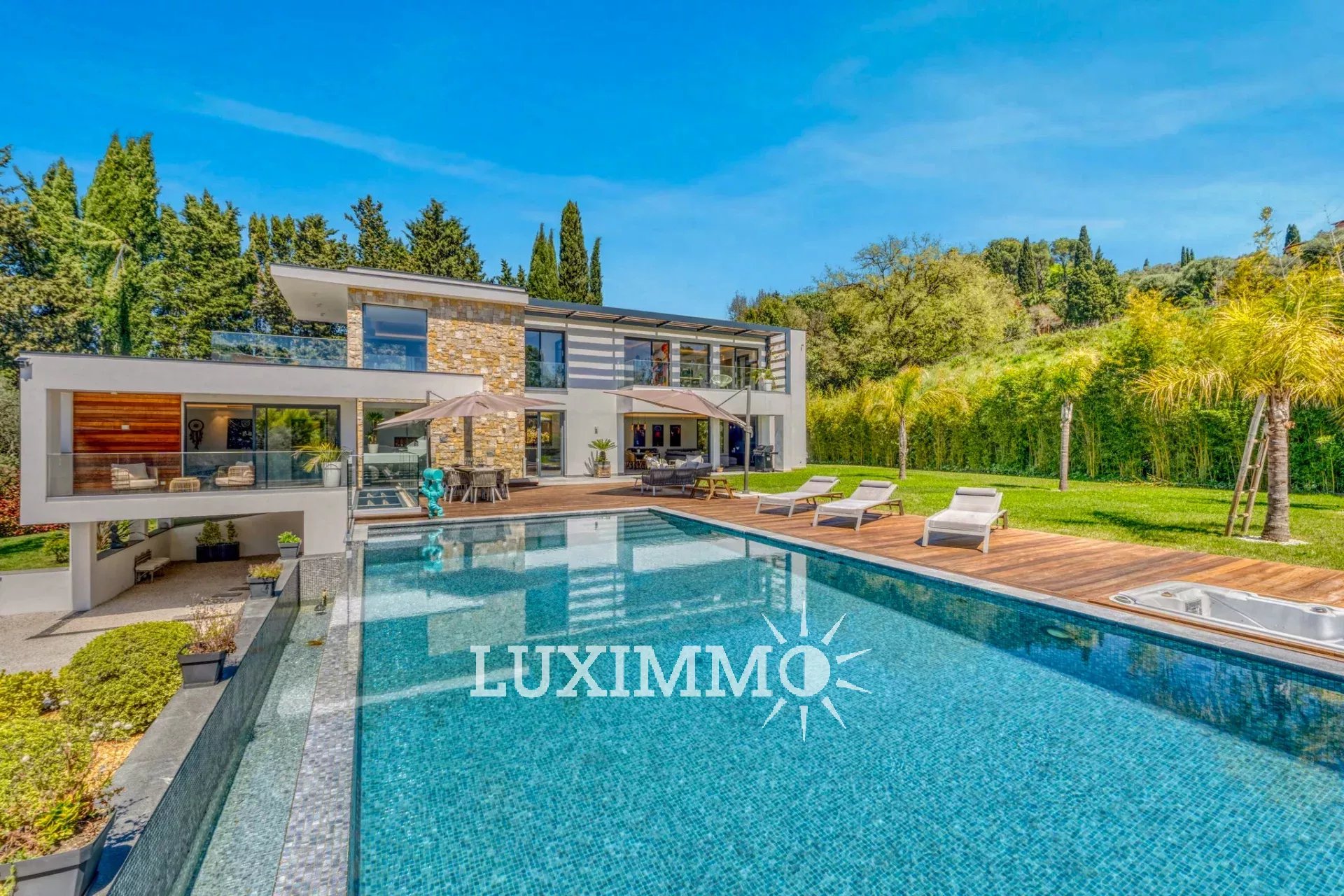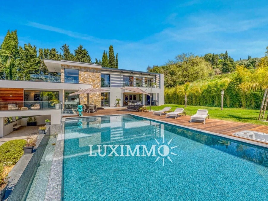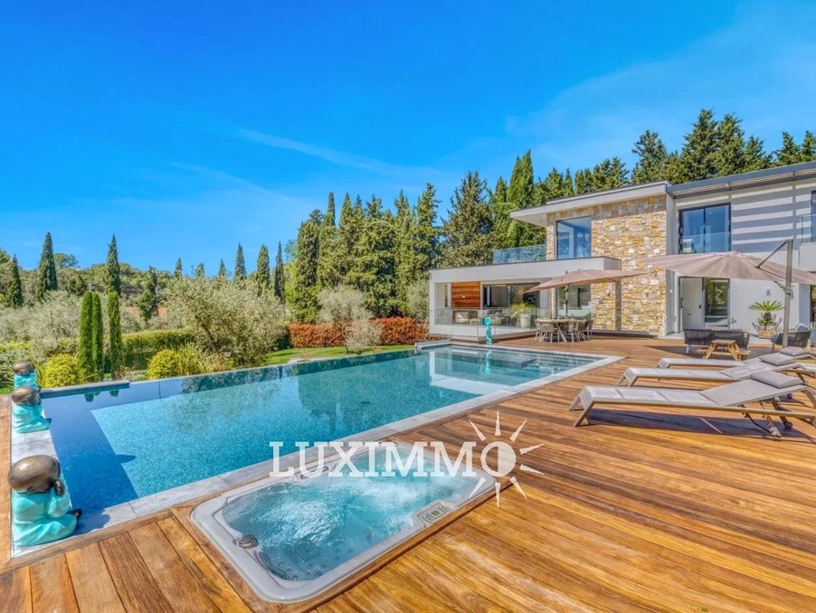 Mougins - Située dans un domaine sécurisé, à proximité du Royal Golf, et bénéficiant d'une belle vue dégagée sur les collines et la campagne. Cette villa contemporaine aux prestations luxueuses de 360m² env. est édifiée sur un terrain paysager de 2100 m2 avec piscine et jacuzzi.