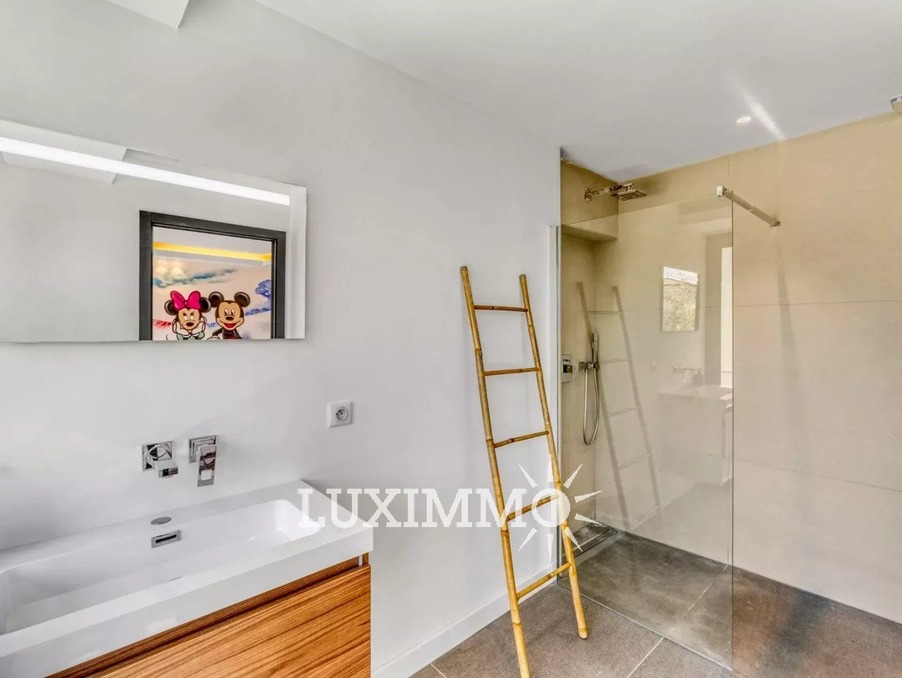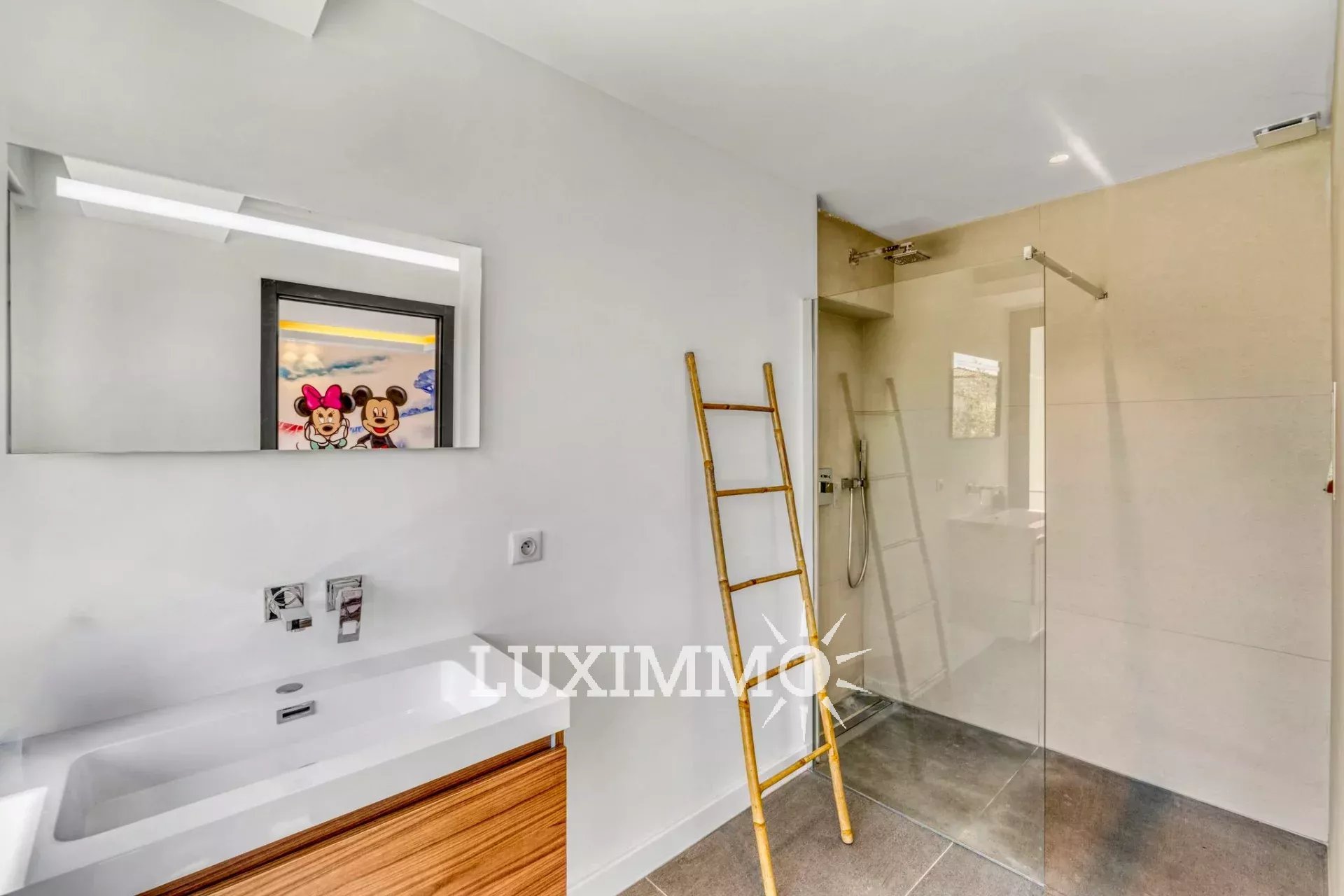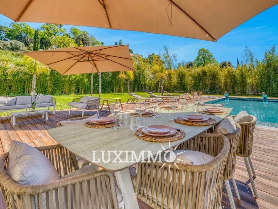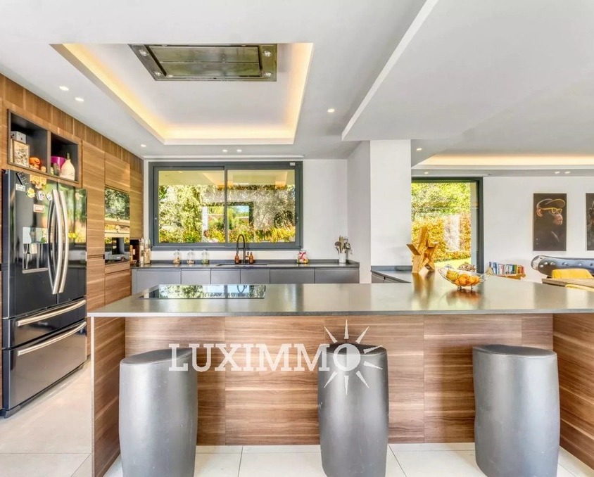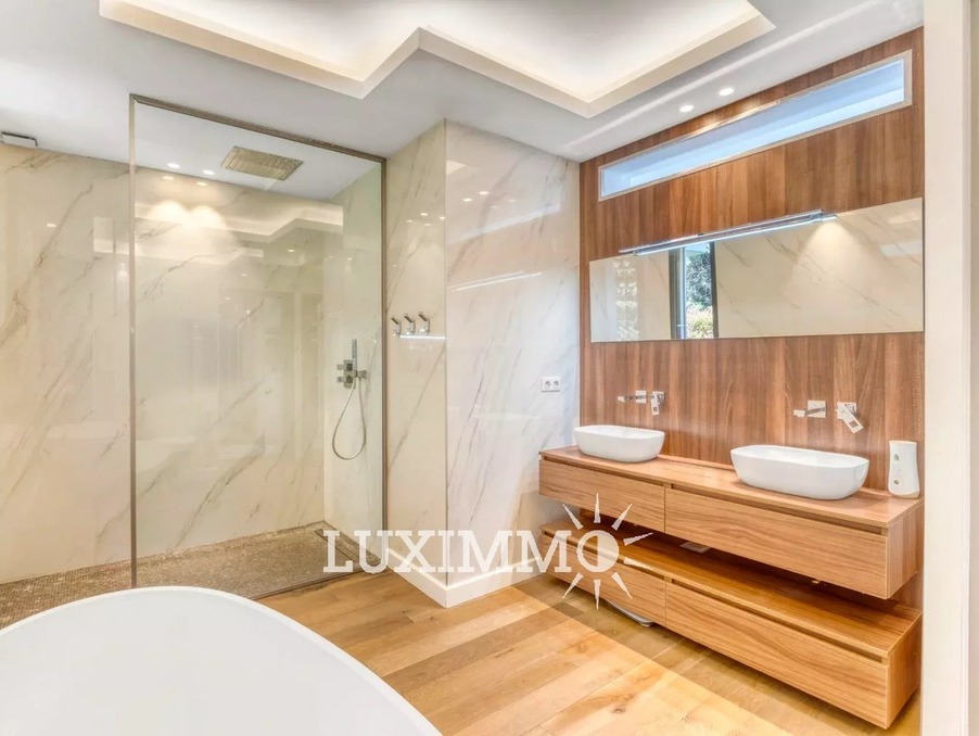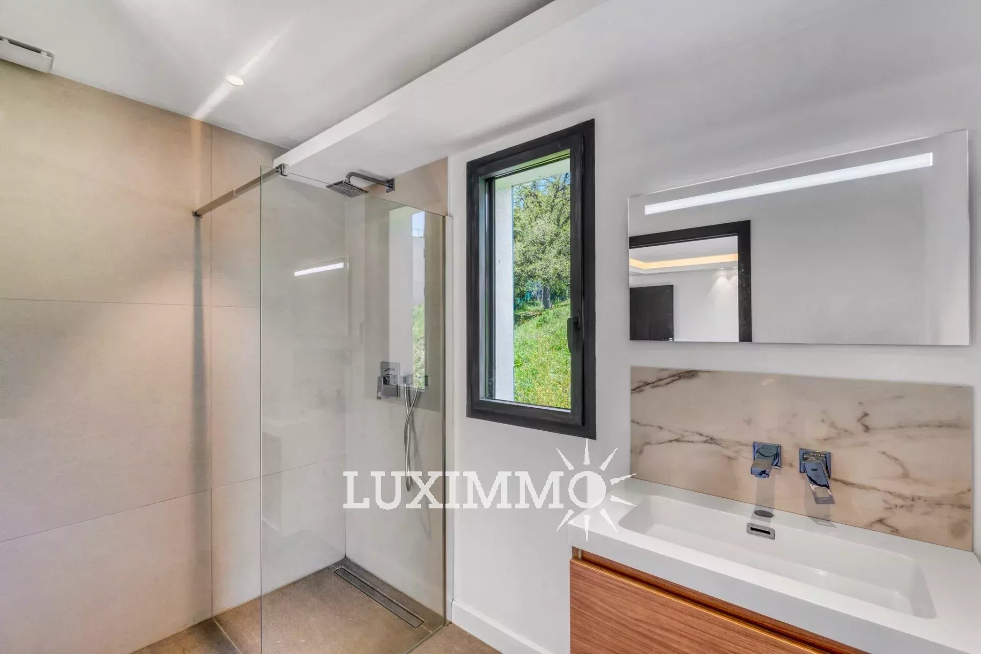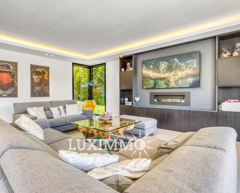Mougins - Située dans un domaine sécurisé, à proximité du Royal Golf, et bénéficiant d'une belle vue dégagée sur les collines et la campagne. Cette villa contemporaine aux prestations luxueuses de 360m² env. est édifiée sur un terrain paysager de 2100 m2 avec piscine et jacuzzi.